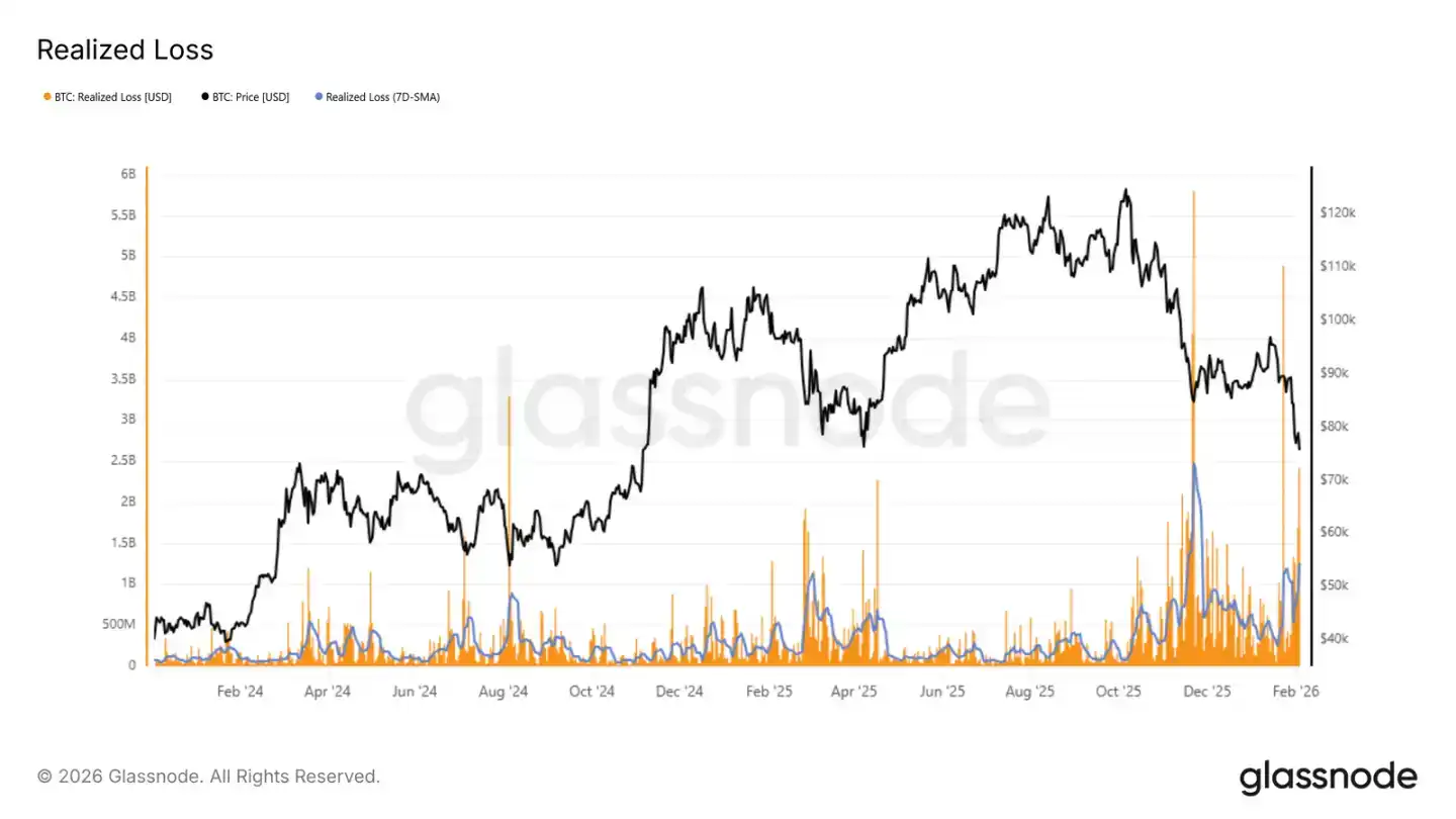 The Realized Loss metric directly reflects the stress level among investors. The current 7-day average Realized Loss has exceeded $1.26 billion daily, showing that panic selling has increased after the market broke below key support.