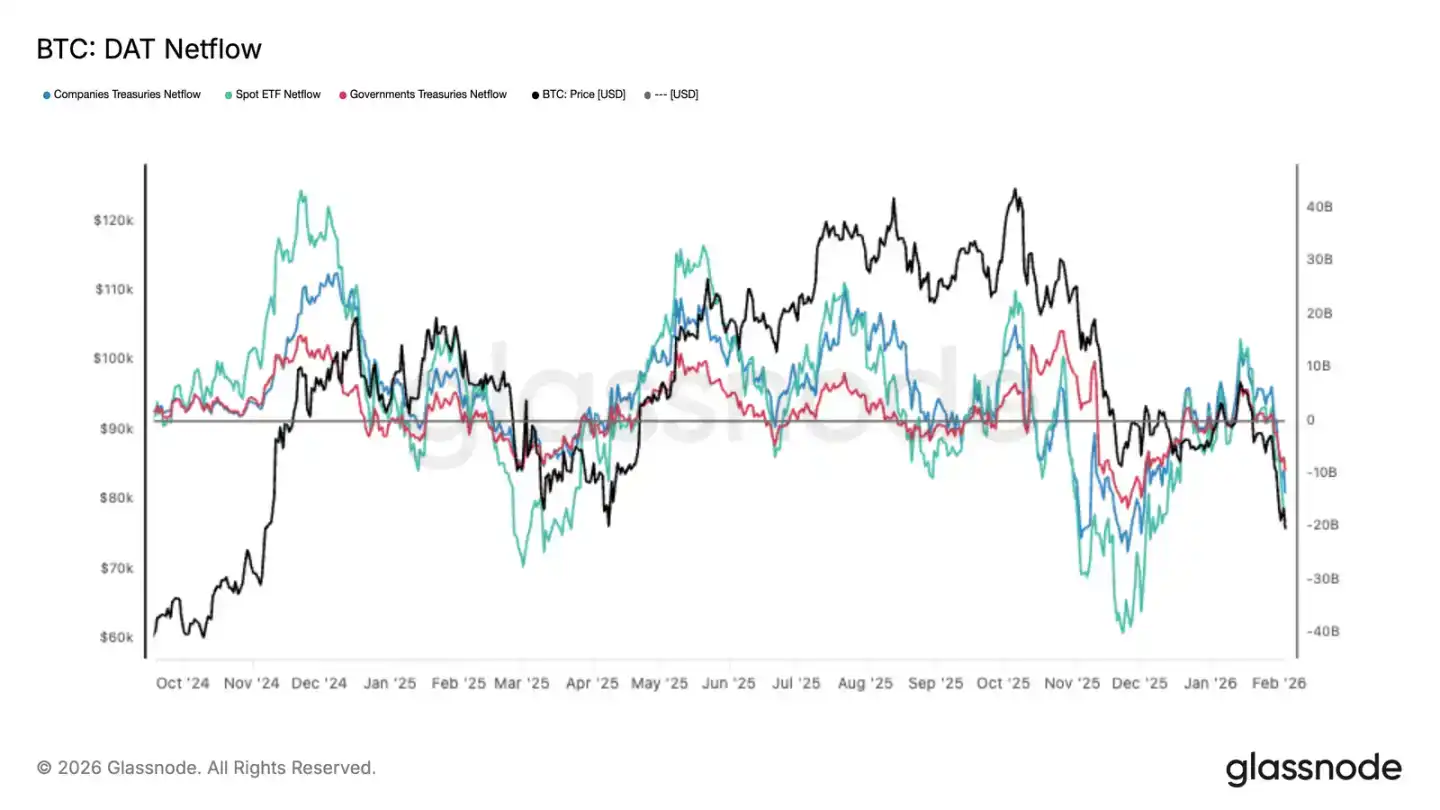 As prices fell, demand from major institutional investors noticeably weakened. Spot ETF inflows slowed, and corporate and government-related capital also decreased, showing reduced willingness for incremental capital to enter the market.