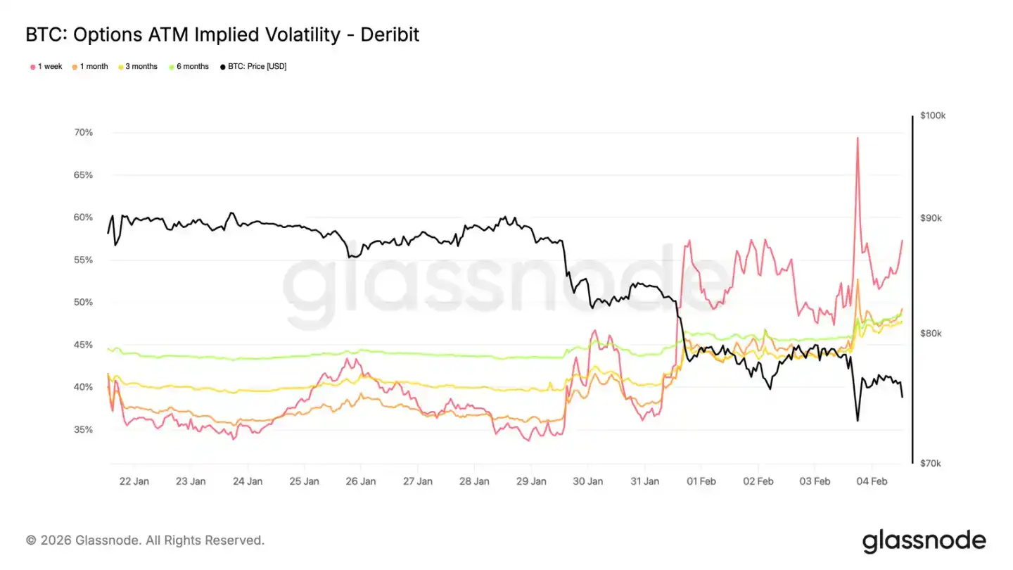 When the price tested the previous high of $73,000 (now turned support), short-term implied volatility rose to near 70%. Volatility levels have increased by about 20 volatility points compared to two weeks ago, with the entire volatility curve shifting upward.