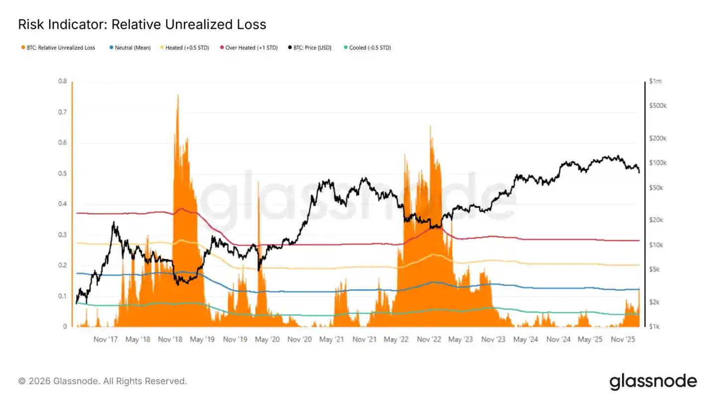 The Relative Unrealized Loss metric (the proportion of unrealized loss to total market cap) helps compare market stress across different cycles. Historical bear market extremes usually exceed 30%, with cycle bottoms in 2018 and 2022 even reaching 65%-75%.