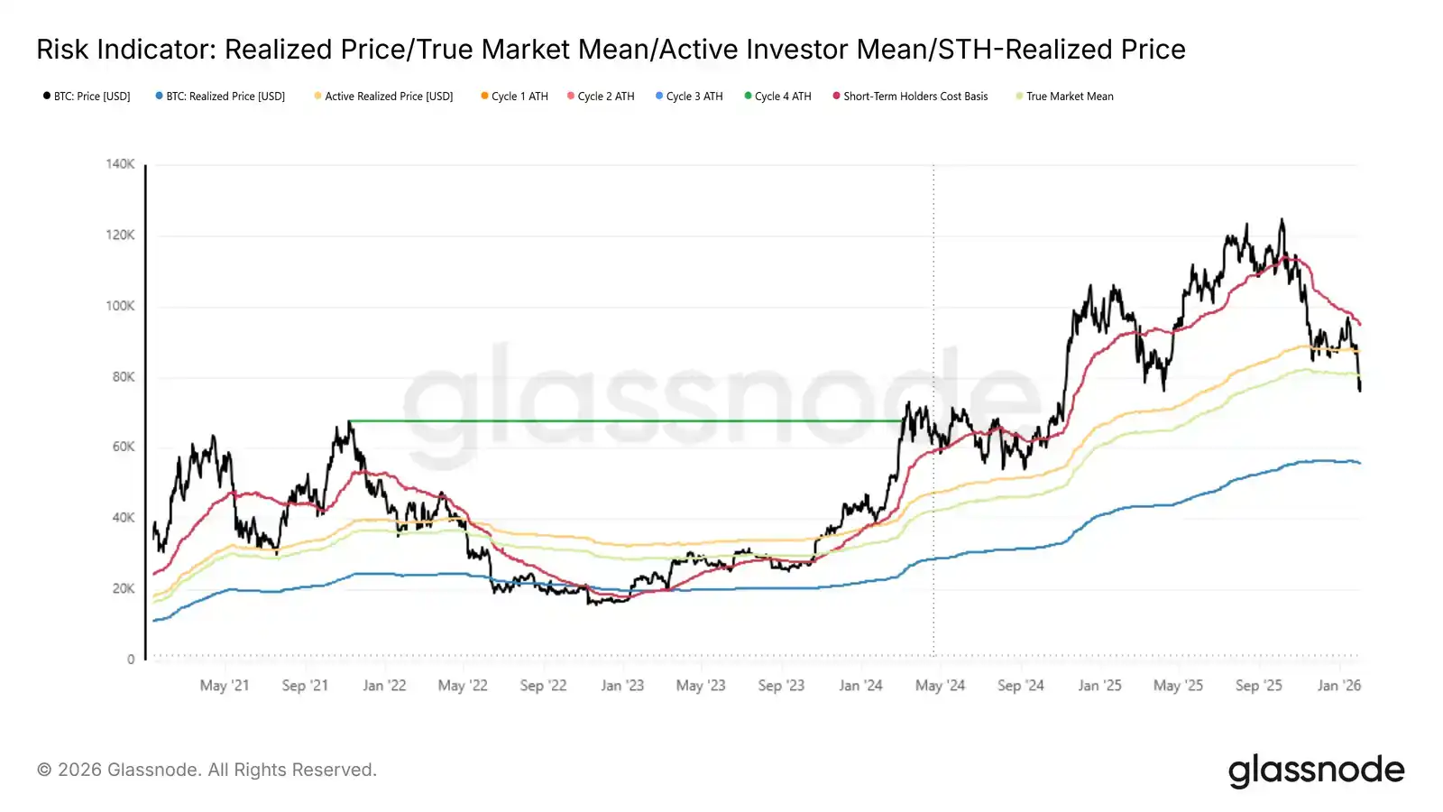 · Bitcoin has confirmed a breakdown, with the price falling below the true market mean, shifting market sentiment to cautious defense.
