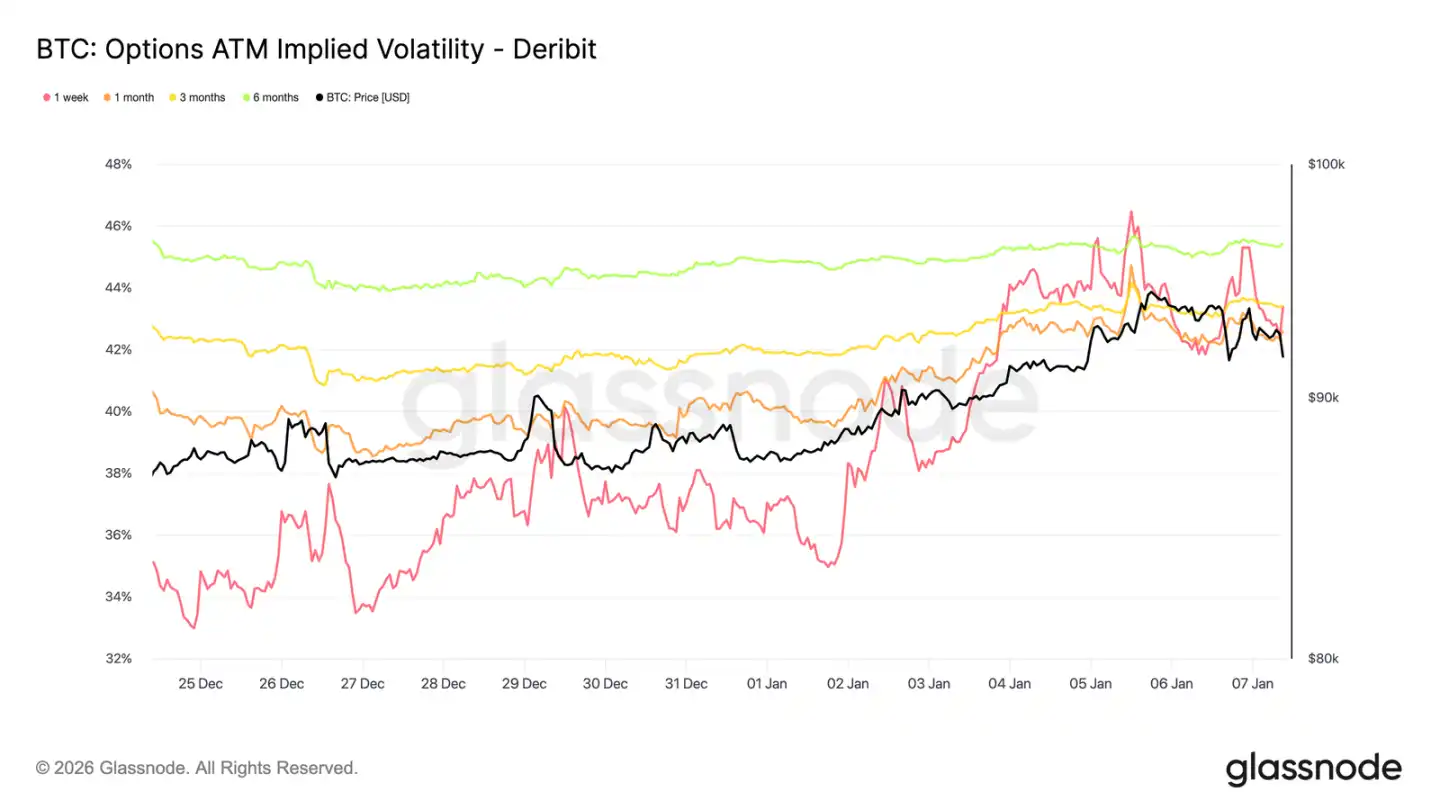 Despite the increase, implied volatility remains compressed. Volatility from one week to six months is concentrated between 42.6% and 45.4%, with a relatively flat curve shape.