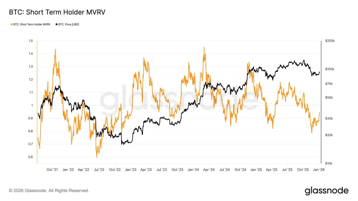This dynamic is also clearly reflected in the Short-Term Holder MVRV ratio. This metric, comparing the spot price to the average cost basis of recent buyers, reflects their profit/loss status. Historically, when this ratio remains below 1 (price below average cost), the market is often bear-dominated. Currently, the ratio has rebounded from a low of 0.79 to 0.95, meaning recent buyers are still at an average unrealized loss of about 5%. Failure to return to profitability (MVRV > 1) soon will keep downward pressure on the market, making this a key watchpoint in the coming weeks.