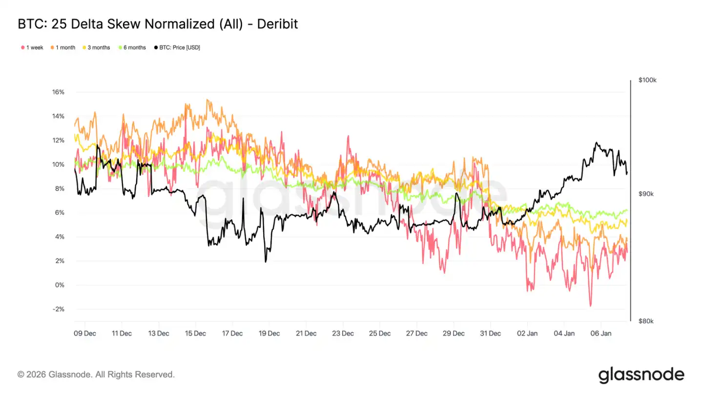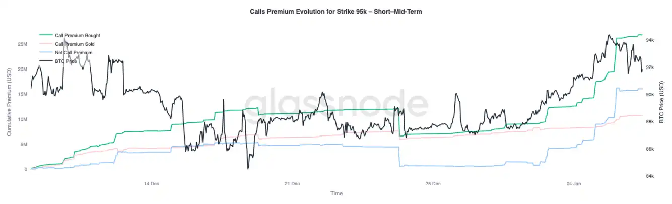 The premium behavior of the $95,000 strike call options serves as an effective indicator for observing sentiment shifts. Call premium buying for this strike accelerated around January 1st when the spot price was still near $87,000, and continued to increase as the price climbed towards the recent high of $94,400.