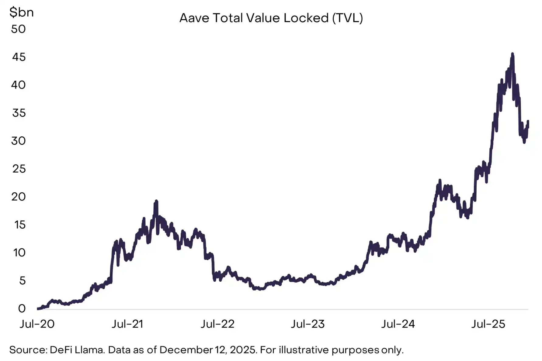 Driven by both improved technological maturity and a better regulatory environment, DeFi applications significantly accelerated in 2025. The growth of stablecoins and tokenized assets are the most prominent success stories, but meanwhile, the DeFi lending space also achieved substantial expansion, led by protocols like Aave, Morpho, and Maple Finance (see Chart 14).