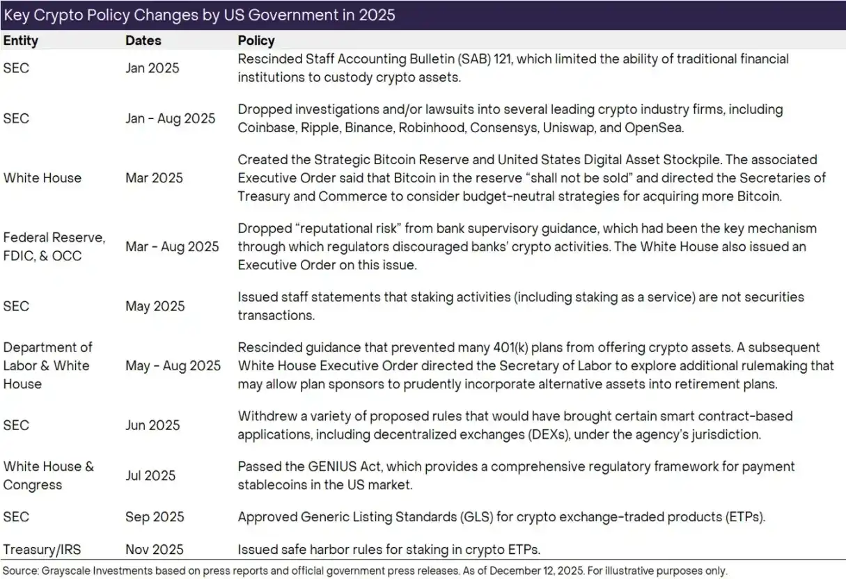 In 2025, the U.S. Congress passed the GENIUS Act for stablecoins, and regulators began adjusting their stance towards the crypto industry, emphasizing consumer protection and financial stability while collaborating with the industry to provide clearer guidance;