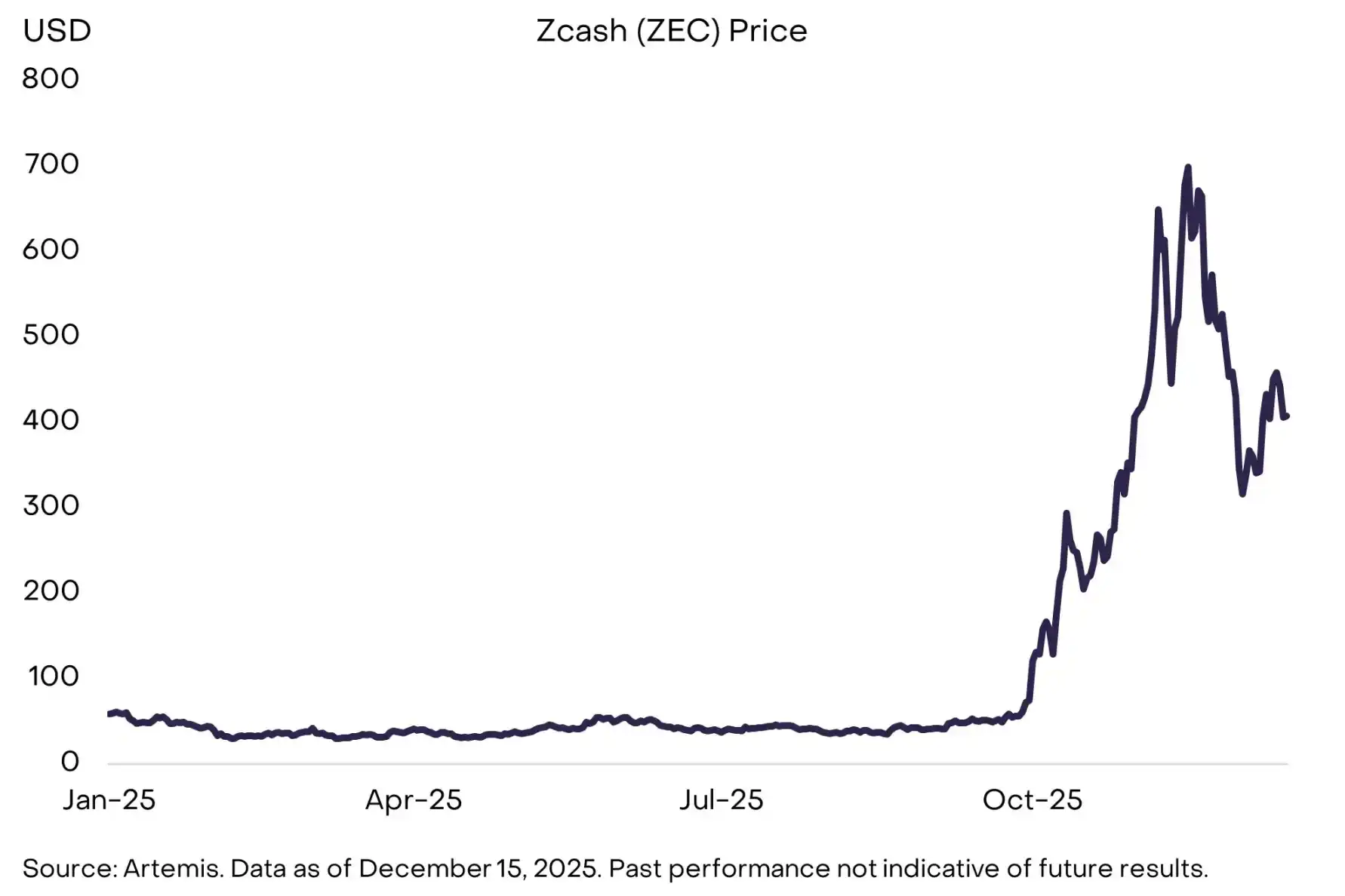 Amid rising investor focus on privacy issues, one potential beneficiary is Zcash (ZEC): a decentralized digital currency structurally similar to Bitcoin but with built-in privacy features. Zcash saw significant gains in Q4 2025 (see Chart 12). Other important projects include Aztec (a privacy-focused Ethereum Layer 2) and Railgun (privacy middleware for DeFi).