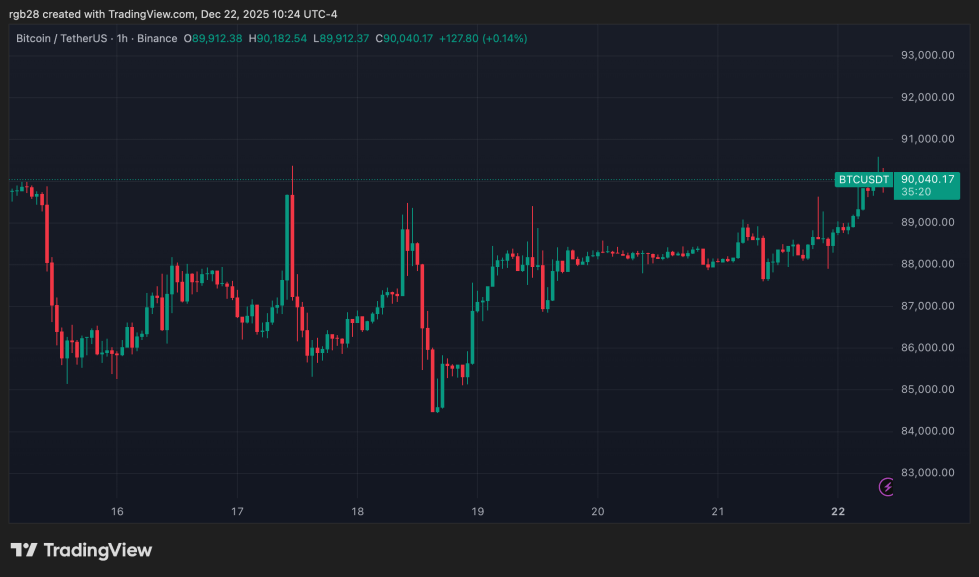 Bitcoin (BTC) trades at $90,040 in the one-week chart. Source: BTCUSDT on TradingView