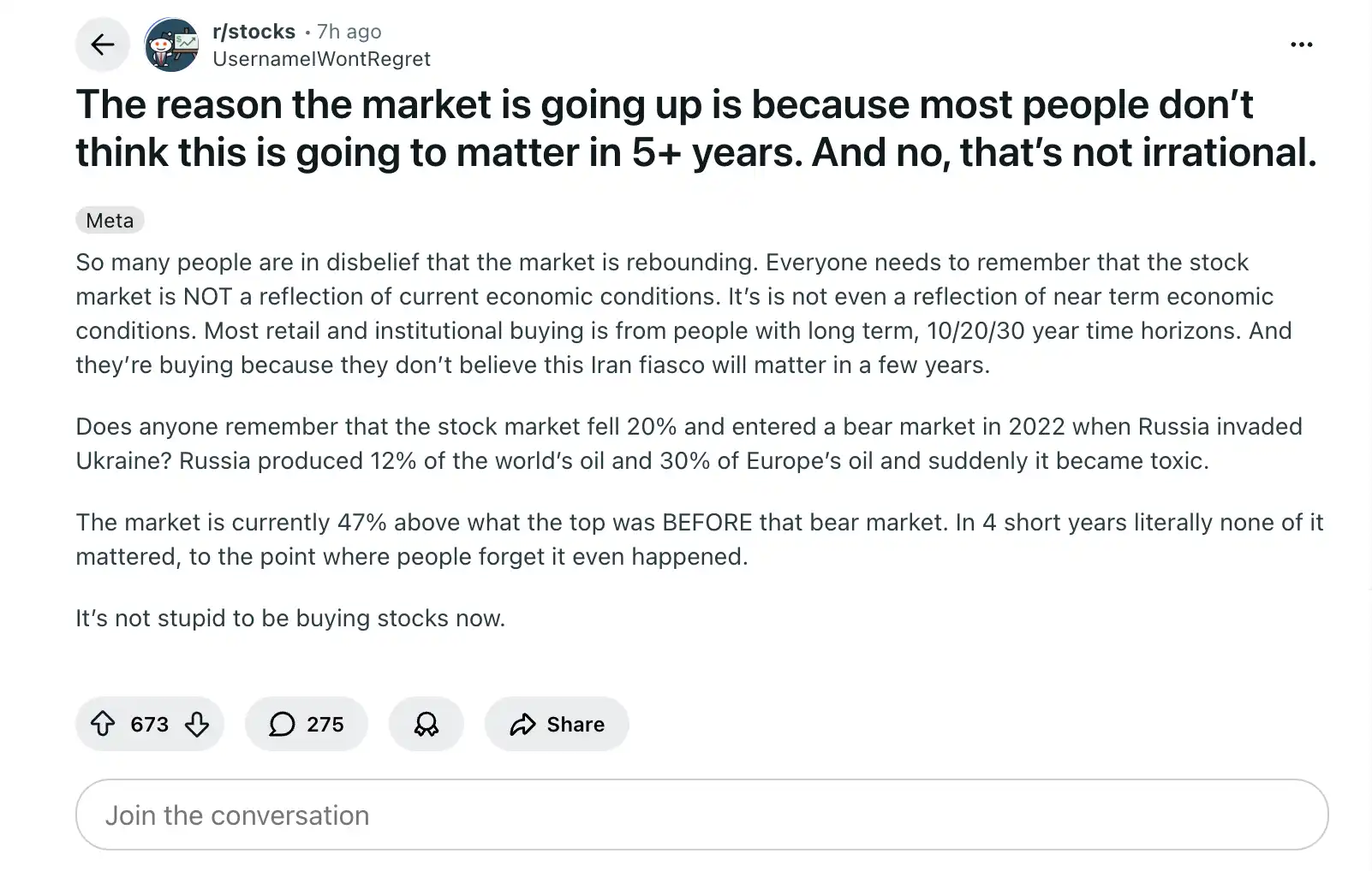 'The market is rising because most people think this won't matter in 5 years; this is not irrational.' This post received 344 upvotes and 199 comments, representing the typical stance of long-term investors.