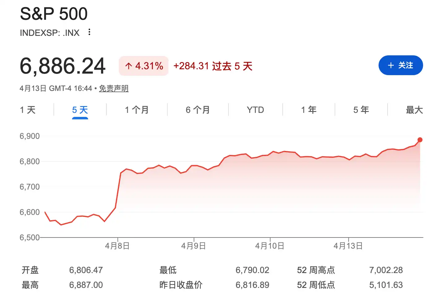 On April 13 (Monday), the S&P 500 closed up 69 points, a gain of 1%, at 6886 points; the Dow Jones Industrial Average rose 302 points, up 0.6%; the Nasdaq Composite Index increased by 1.2%. On the same day, Trump announced on a social platform that the U.S. Navy would immediately initiate a blockade operation in the Hormuz Strait. Brent crude oil broke through $100 per barrel during the session before pulling back to close around $98.16, while WTI crude closed at $97.82.