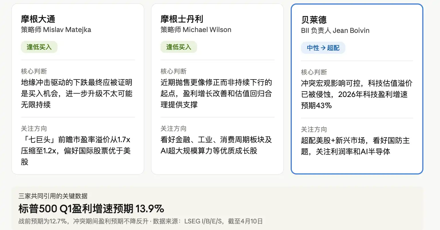 The three institutions cited the same set of data: according to LSEG I/B/E/S data, as of April 10, the expected Q1 profit growth rate for the S&P 500 is 13.9%, higher than the pre-war 12.7%. In other words, nearly seven weeks after the conflict erupted, analysts have not only failed to lower profit expectations but have instead raised them.