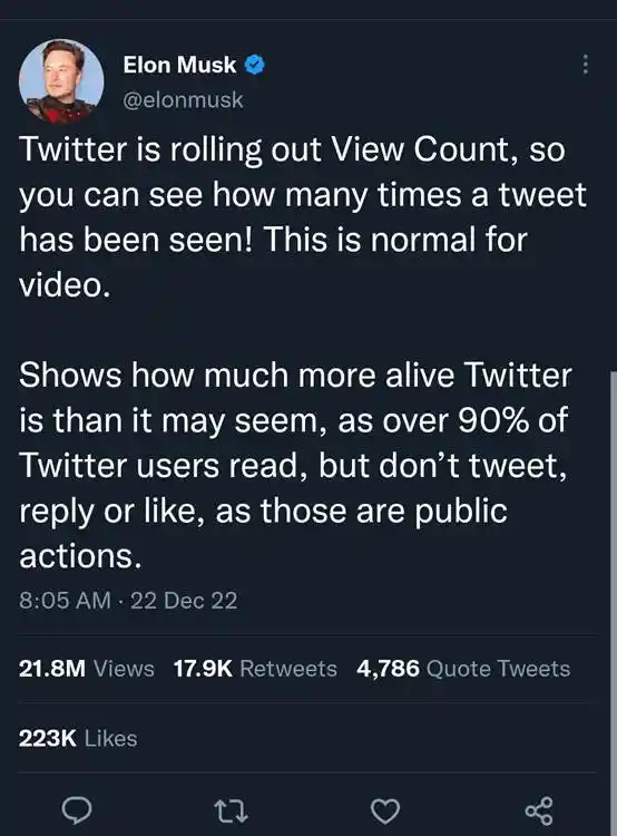 Actually, making view counts visible to everyone was an update introduced after Musk acquired Twitter. Previously, only the poster could view the view count of a post. Musk personally tweeted to explain the reason for this update: