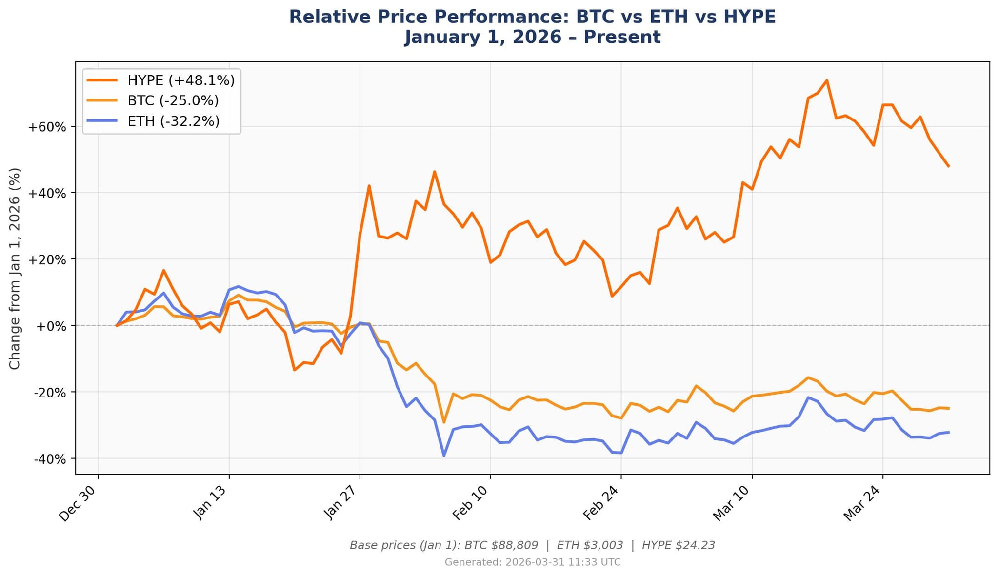 - HYPE has outperformed ETH and BTC by over 70% in Q1, making it a key outlier and crucial part of the crypto watchlist into Q2.