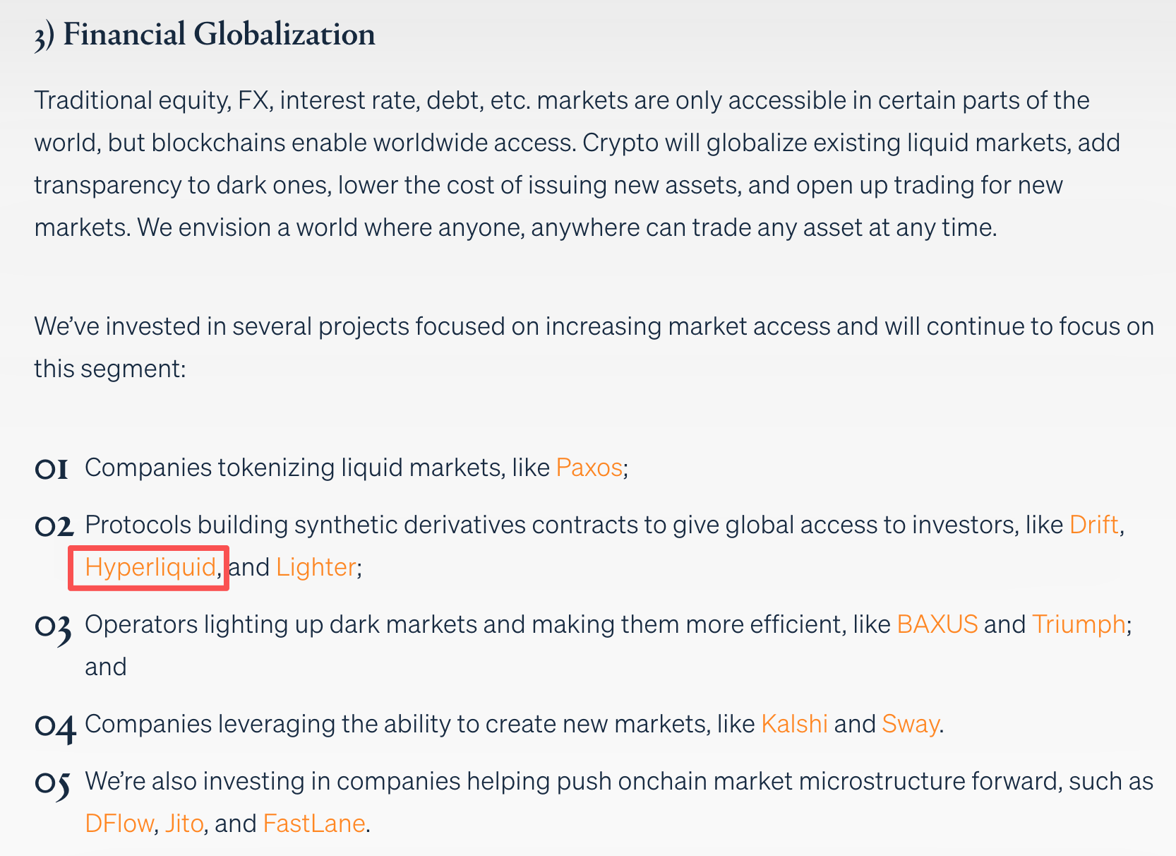 Crypto Banter founder Ran Neuner discovered that in the five-year investment theses published the weekend prior by Multicoin's other co-founder, Tushar Jain, Hyperliquid was prominently listed as a representative project for the third thesis, "Financial Globalization," while DePIN, which Kyle Samani had long been extremely bullish on, was completely absent.