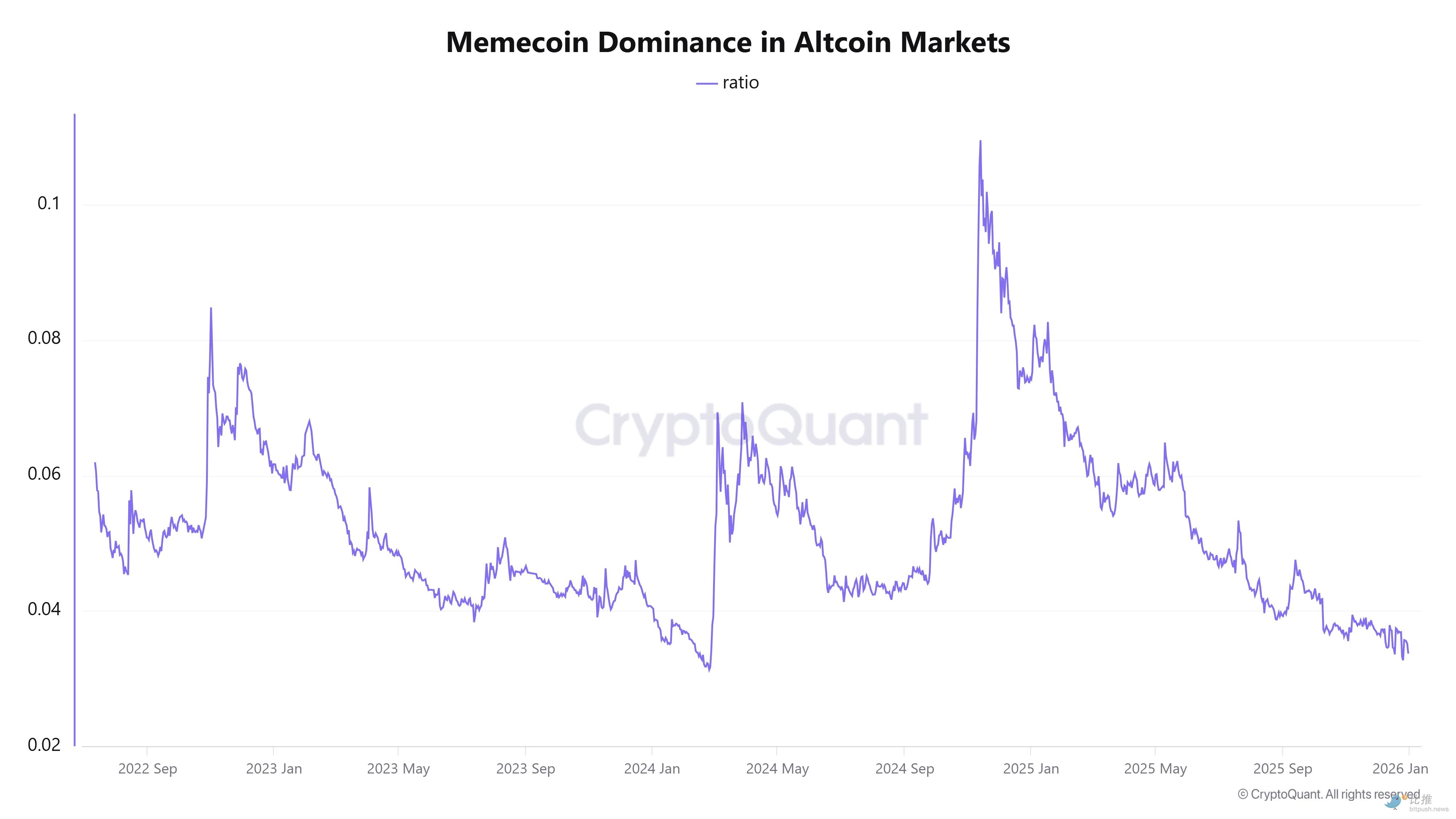 CryptoQuant charts show that the "dominance" of meme coins in the altcoin market is still near the low levels seen since 2022, with no trend of increase. This means retail speculation heat has not yet systematically returned.