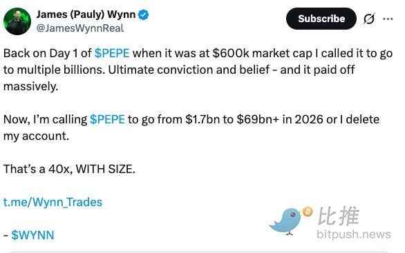 Famous Hyperliquid trader James Wynn released a 2026 prediction, stating that PEPE's market capitalization could surge from the current $2 billion to $69 billion, comparing it to SHIB from the last cycle (which surged from $3.5 billion to $41 billion). Wynn's "delete my account if it fails" vow greatly stirred community sentiment.
