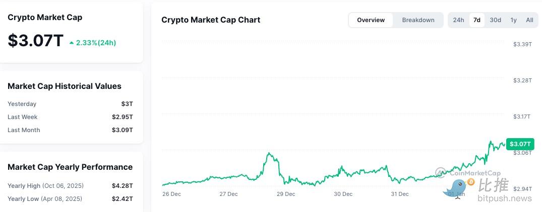 On January 2nd, Bitcoin briefly rose above $90,700, with an intraday increase of about 2%; Ethereum surged over 4%, breaking through the $3,100 mark.
