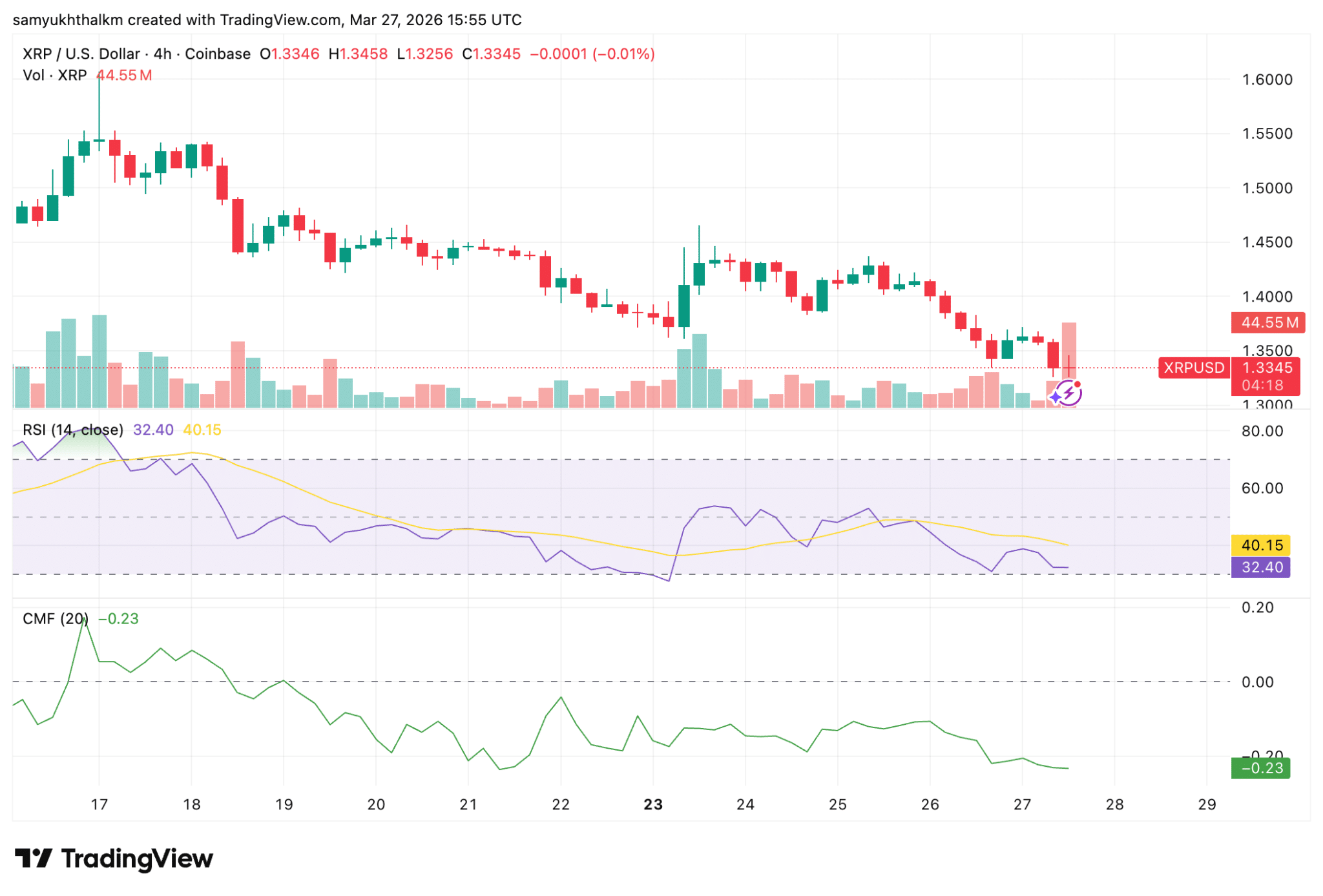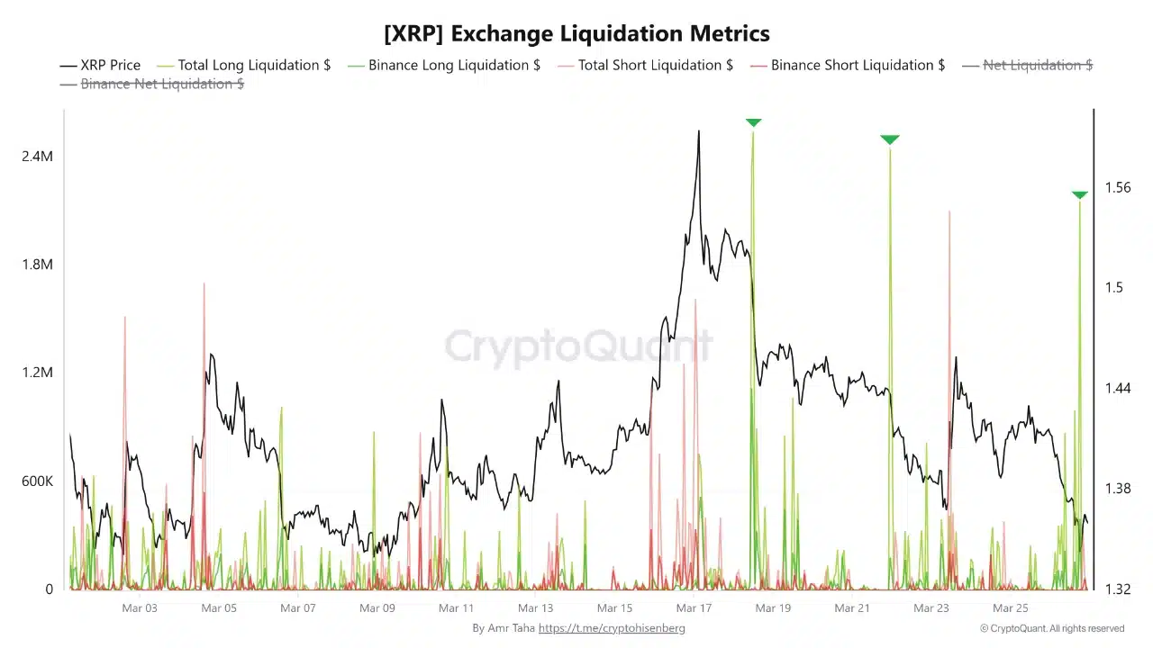 On the 4-hour chart, XRP was in a downtrend, struggling to hold above the $1.35 level. RSI is close to oversold territory, but without a convincing bounce. At the same time, the CMF showed outflows and a lack of buying interest.