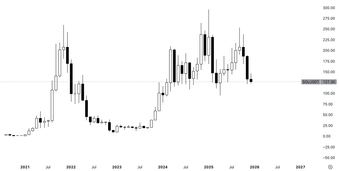 This chart of Solana, a top-ten crypto asset by market cap, almost集中体现了 all the problems faced by crypto asset investment. First, these assets are not long-term compound interest assets. They don't grow steadily year after year like the 'Magnificent 7' (Mag 7) tech stocks; their price movements are more like a 'roller coaster.' Although they have shown extremely astonishing gains—from a low of about $8 after the FTX crash to $296 a few months ago—the fact that Solana subsequently pulled back 50% from its high once again confirms a core judgment: these assets must be 'traded,' not 'held' long-term.