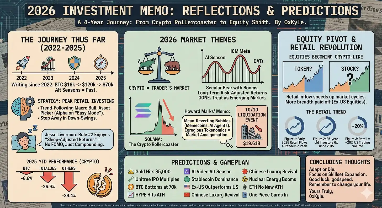 In his 2026 strategy, analyst Kyle from DeFiance Capital argues that the crypto market has become a structural bear market dominated by traders, not long-term holders. He highlights that most cryptocurrencies, including major ones like Solana, are highly volatile, lack sustainable value, and are unlikely to reach previous all-time highs again. Kyle advocates for investors to shift focus towards traditional equity markets, which are becoming more "crypto-esque" due to increased retail participation and narrative-driven trading. He emphasizes the importance of being a generalist, identifying strong narratives early, and adapting to high-volatility environments. Kyle also shares his personal move to small-cap stocks, which offer asymmetric returns similar to earlier crypto opportunities. His predictions include gold reaching $5,000, a potential Bitcoin bottom around $70,000, and continued outperformance of non-US equities. The piece concludes with a review of his mixed 2025 predictions and a call for adaptability in a rapidly changing investment landscape.