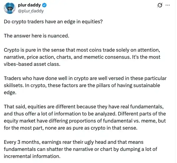 Against the backdrop of持续走低 volatility in the crypto market, many people have already started转向 the stock market; there has also been a lot of discussion on timelines, debating whether 'traders from the crypto market' have some kind of advantage in stock investing. My view is: just because you are 'from crypto' does not mean you naturally have an advantage in the stock market. Of course, some skills may indeed help with the migration—such as the ability to adapt to high-volatility environments—but ultimately, you still need to learn and adjust to truly adapt to the stock market.