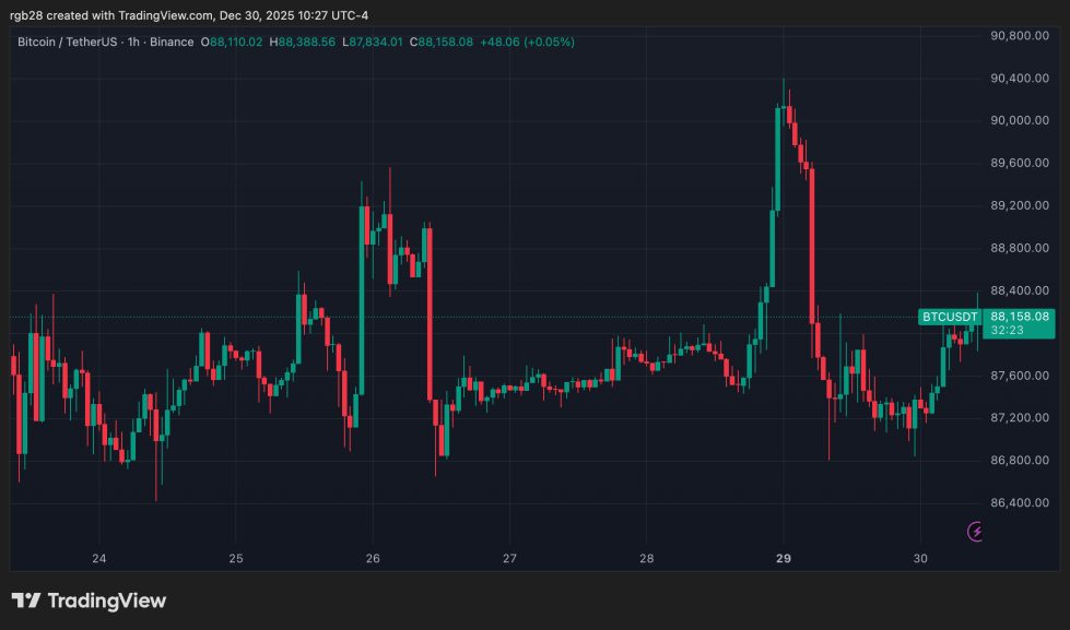 Bitcoin (BTC) trades at $88,158 in the one-week chart. Source: BTCUSDT on TradingView
