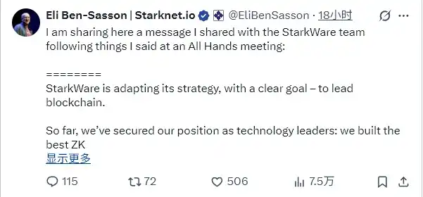 On April 13th, Eli Ben-Sasson, CEO of the ZK-Rollup infrastructure company StarkWare (behind Starknet), announced at an all-hands meeting that the company would undergo layoffs and restructure into two separate business units, focusing on revenue generation and Starknet development. The company initially launched the StarkEx scaling engine and introduced Starknet as an Ethereum Layer 2 Validity Rollup to the mainnet in late 2021. It developed its own Cairo programming language, Sierra intermediate representation layer, and a post-quantum proof system, establishing itself as a technical benchmark in the ZK Rollup field. In 2022, it completed multiple funding rounds, totaling approximately $260 million, with its valuation once reaching as high as $8 billion, making it one of the highest-valued ZK projects in the crypto industry at the time.