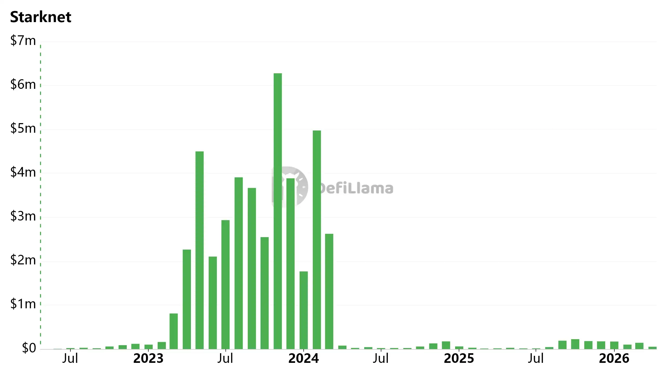 According to DefiLlama data, the Starknet network's on-chain monthly revenue peaked at nearly $6.3 million in November 2023. However, since April 2024, its monthly revenue has been only tens to hundreds of thousands of dollars, a drop of over 95%.