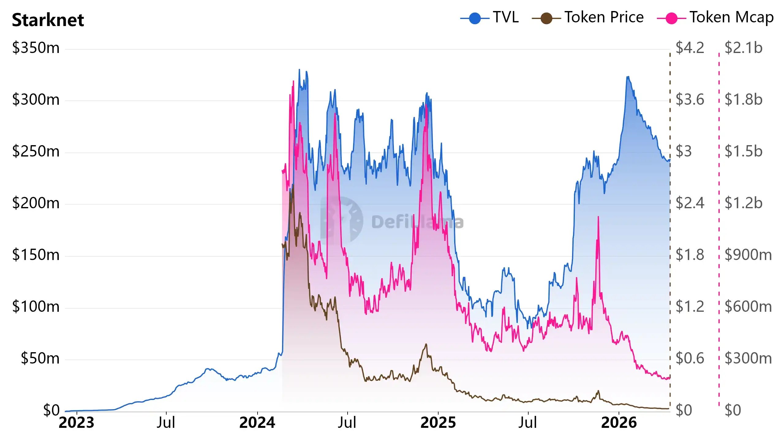 Starknet's situation is even more severe. Its TVL is currently only about $241 million, less than one-twentieth of Base's; its native token STRK has plummeted from the airdrop high in February 2024 to $0.033, with a total market capitalization of approximately $187 million—even lower than the company's historical total funding of $260 million.