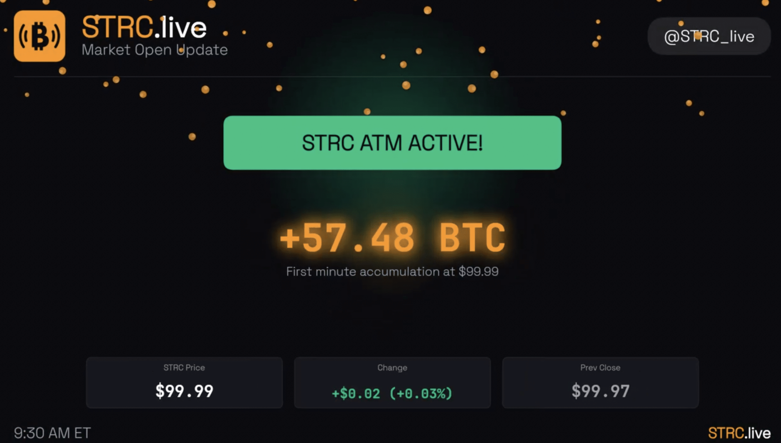 This comes as the Strive Digital Credit ETF (STRC) opened at $99.99 with 4000 shares in the first minute. Looking closer, 79,000 shares were issued through at‐the‐market (ATM) transactions during pre‐market hours. In fact, 57.48 BTC had already been stacked before the opening bell.
