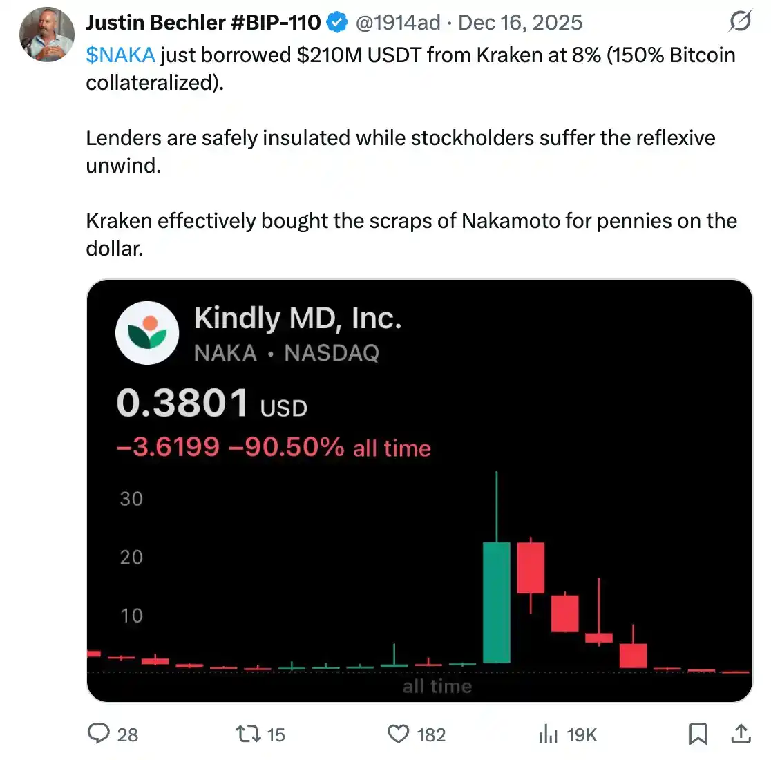 Do the math: The lender has $315 million worth of Bitcoin as collateral for a $210 million loan. If NAKA's stock goes to zero, Kraken takes the collateral. If Bitcoin drops 33%, Kraken remains unscathed. At every stage of this drama, the lenders were tightly protected, while common shareholders bore the full brunt of the reflexive crash.