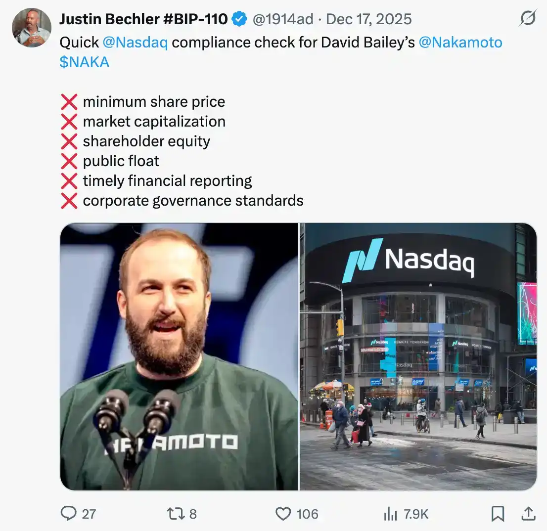 If delisted, Nakamoto would be unable to conduct ATM (at-the-Market) offerings, issue convertible bonds, or use stock as acquisition currency. Everything Bailey assembled in this shell relies on a Nasdaq listing that currently cannot be maintained.