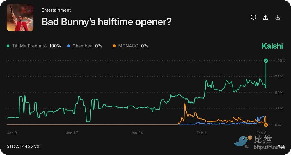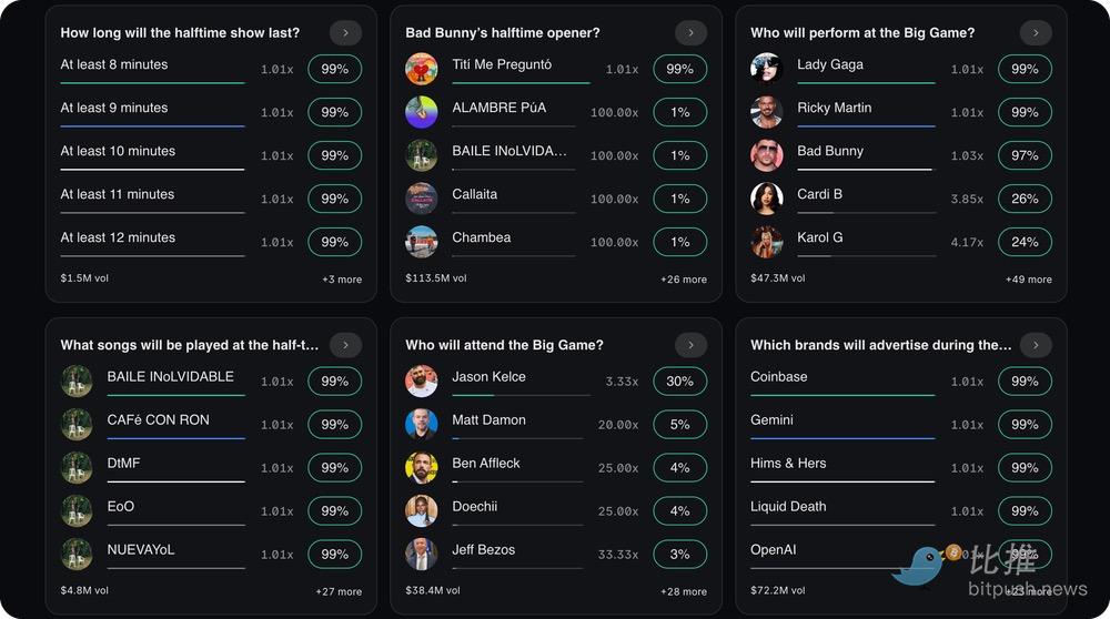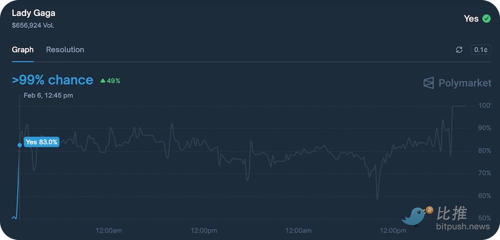 However, where Polymarket truly shines is its primary use case—information discovery. In its halftime show performer market, Lady Gaga's probability remained stable at around 80% in the days leading up to the game—well before her surprise appearance at the halftime show, which Billboard magazine had not reported on and genuinely surprised everyone I watched with.