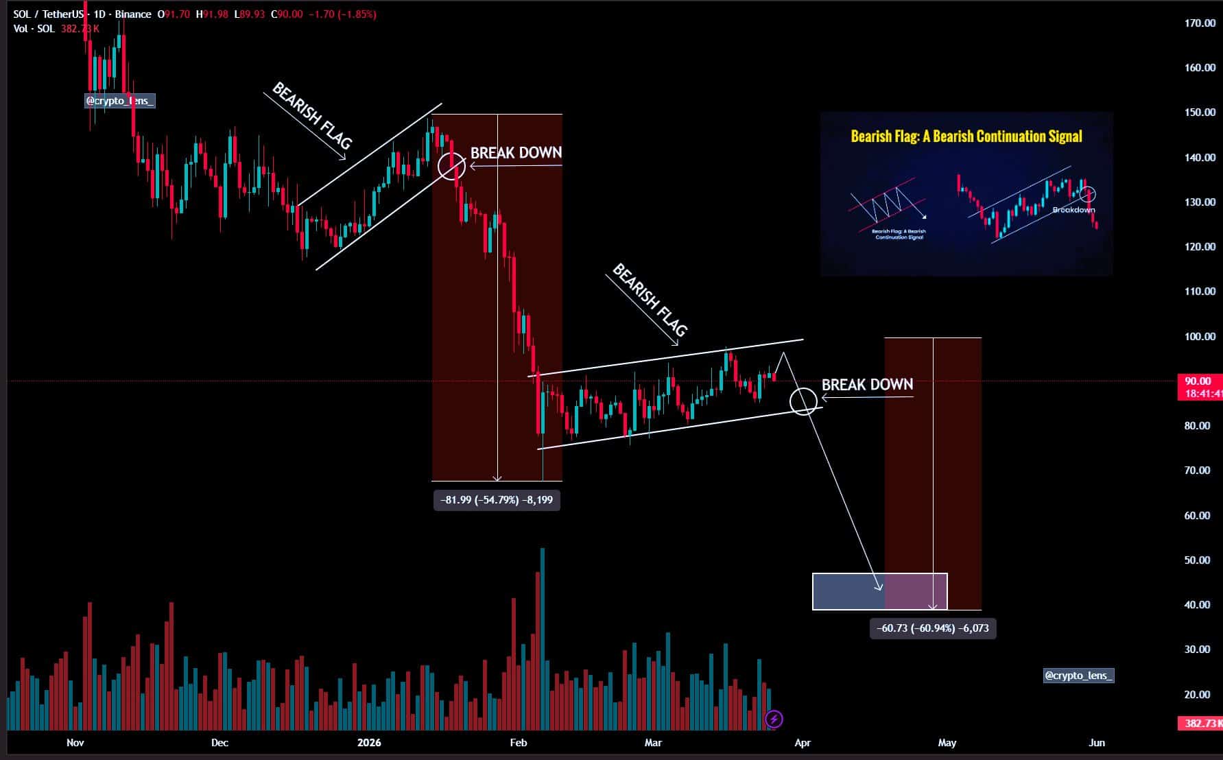 An analyst projected the likelihood of a major crash, citing a previous pattern. According to the analyst, SOL formed a bearish flag pattern, and the last time the structure formed, SOL crashed 56% to $67.