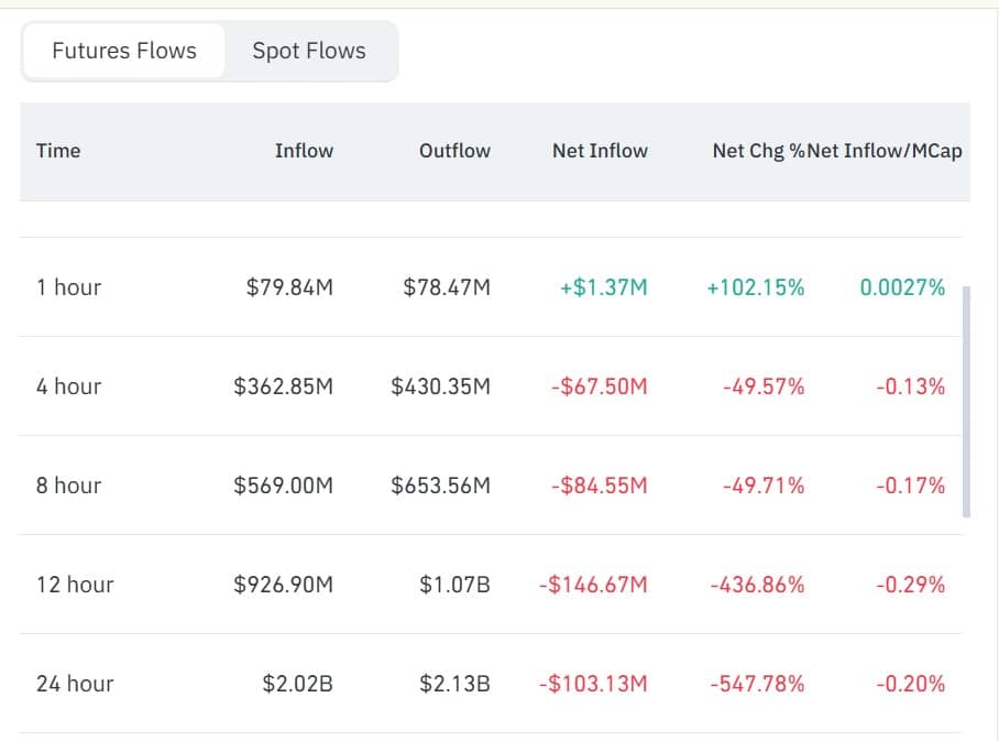 CoinGlass data showed Futures outflows climbing to $2.13 billion, while inflows slipped to $2.02 billion, as of writing. As a result, netflow turned negative again, plunging 547% to –$103 million.