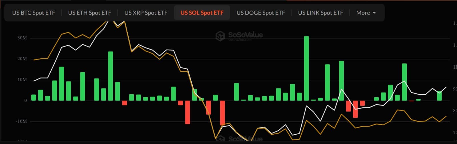 Over the past few days, SOL spot ETFs have avoided net outflows, with one session breaking even. According to Sosovalue data, they recorded $4.5 million in net inflows.