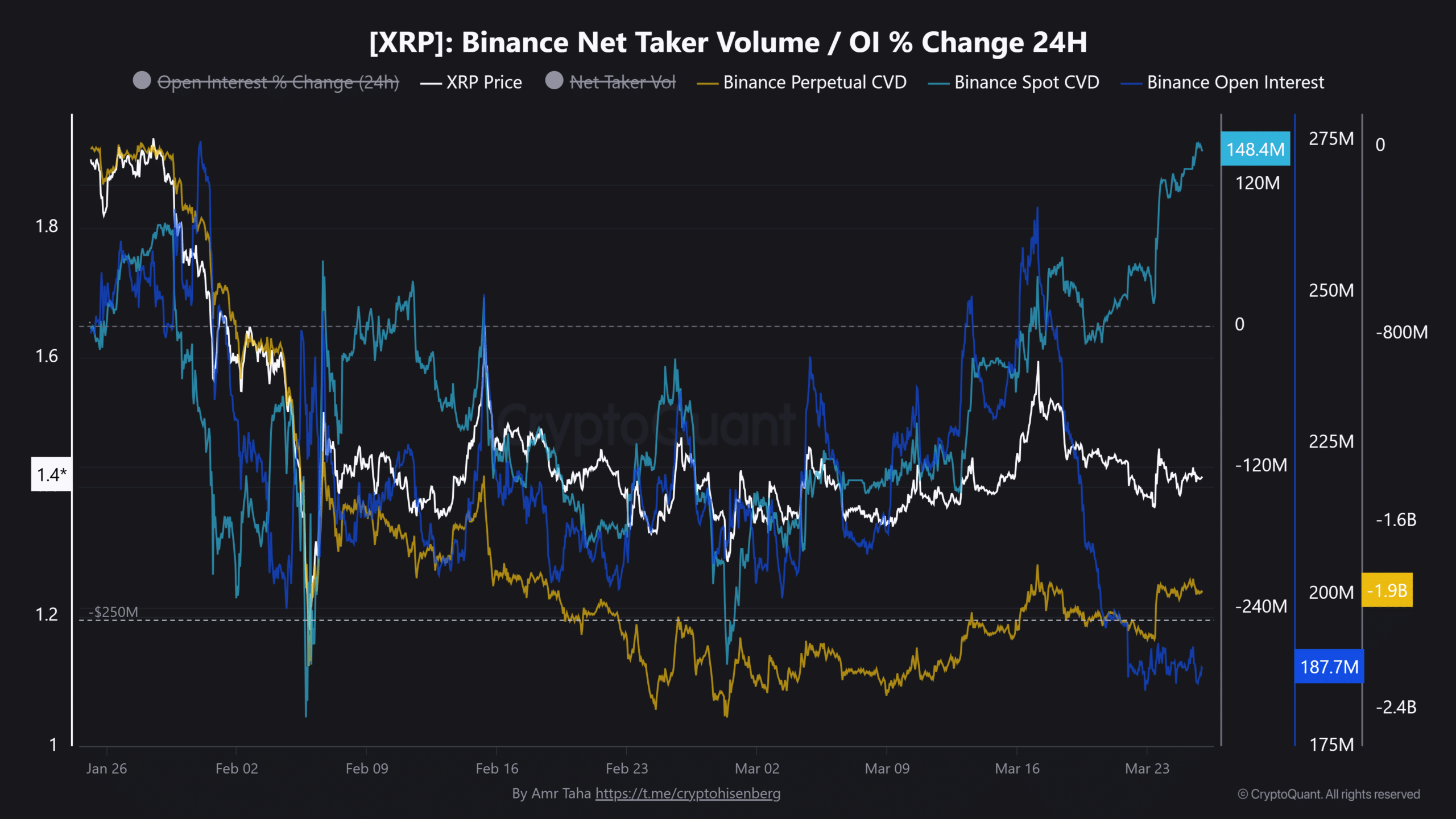 QWhat does the divergence between Spot CVD and Perpetual CVD indicate about XRP's market activity?