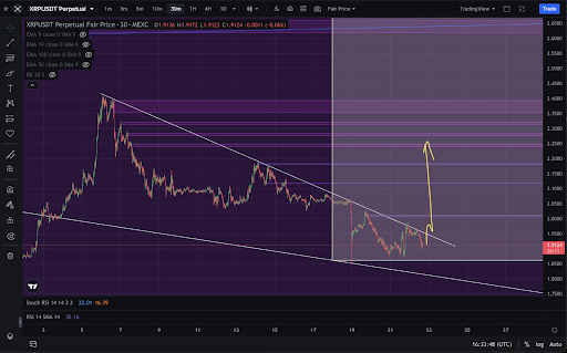 According to the technical analysis in question, XRP has been carving out a tightening pattern directly beneath a descending trendline that has acted as resistance since the beginning of the year. XRP printed a higher high of $2.4 in early January, retraced, and then began compressing into a narrow range of lower highs on the 30-minute candlestick chart.