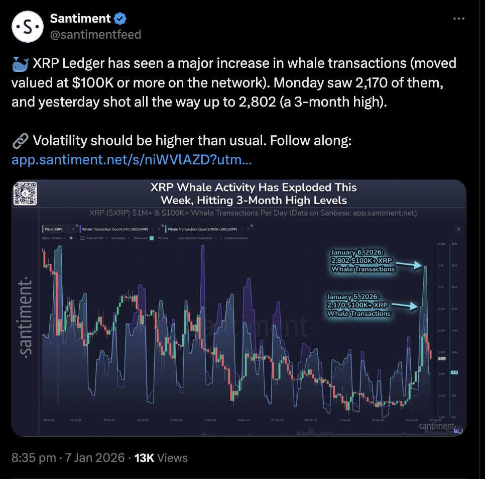 Blockchain analytics firm Santiment said the XRP Ledger recorded a sharp increase in “whale” transactions—defined as transfers worth $100,000 or more.