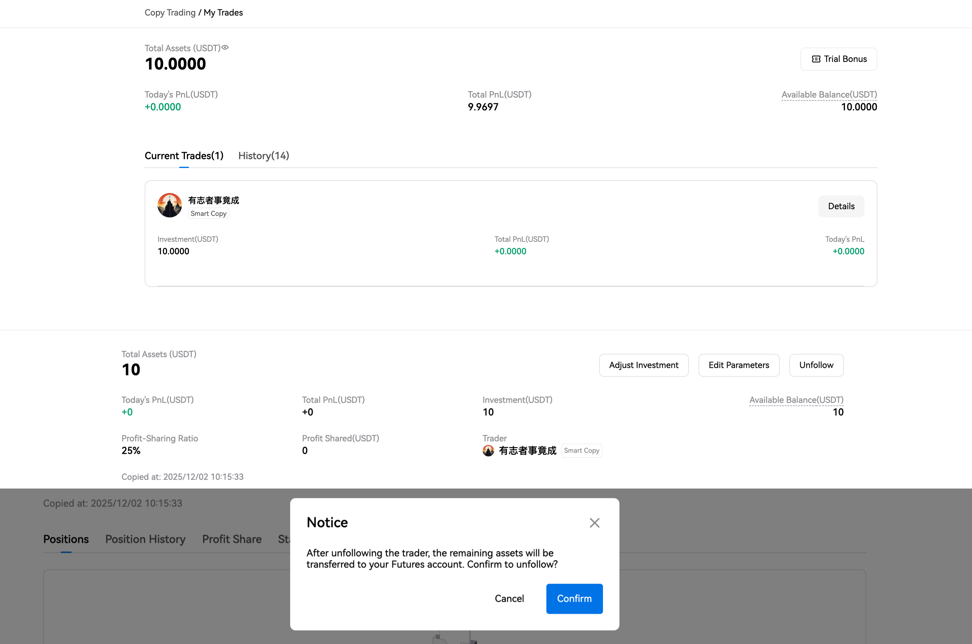- Во всплывающем окне подтверждения нажмите "Подтвердить", чтобы отменить Copy Trading.