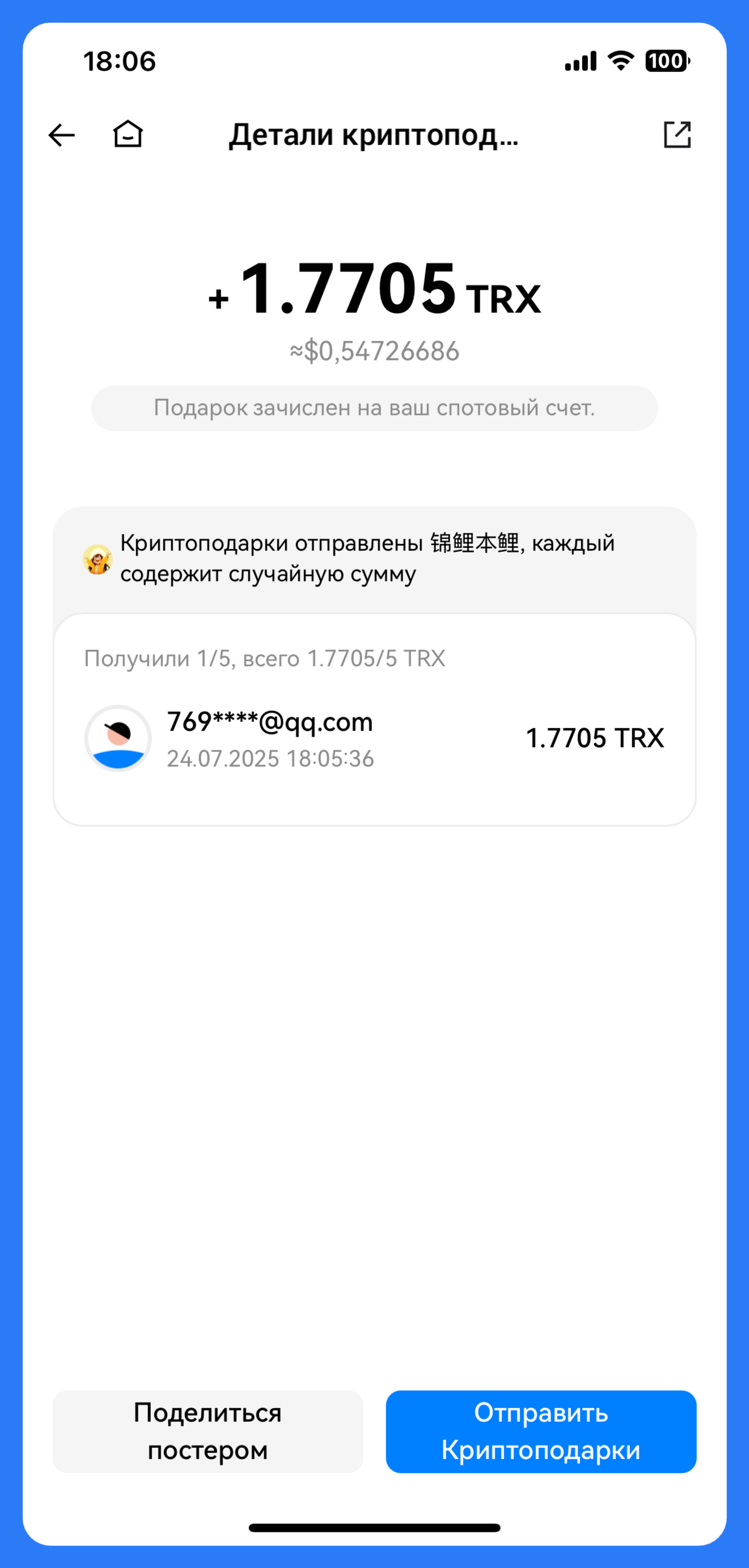 Чувствуете себя везучим? На странице сведений о криптоподарках нажмите "Поделиться", чтобы пригласить друзей и порадовать их. Кроме того, вы можете нажать "Отправить криптоподарки", чтобы подарить подарки своим друзьям.