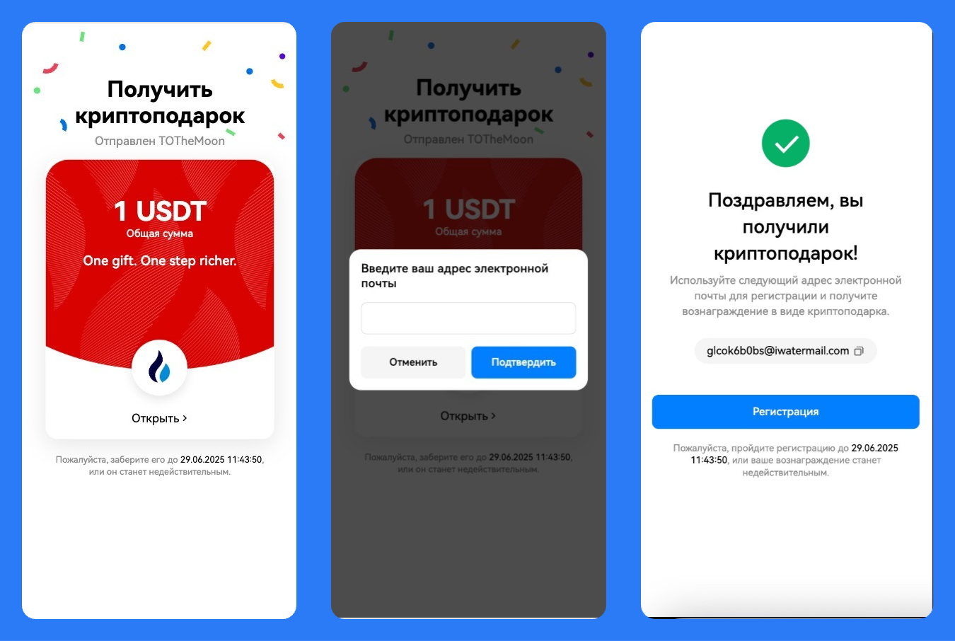 Нажмите на ссылку с криптоподарком, которую вы получили, введите свой адрес электронной почты и подтвердите его. Как только ваш адрес электронной почты будет подтвержден, криптоподарок будет успешно получен.