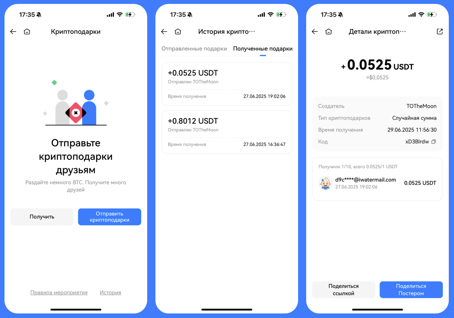 Чтобы просмотреть полученные вами криптоподарки, перейдите на страницу Криптоподарки > История > Полученные подарки.
