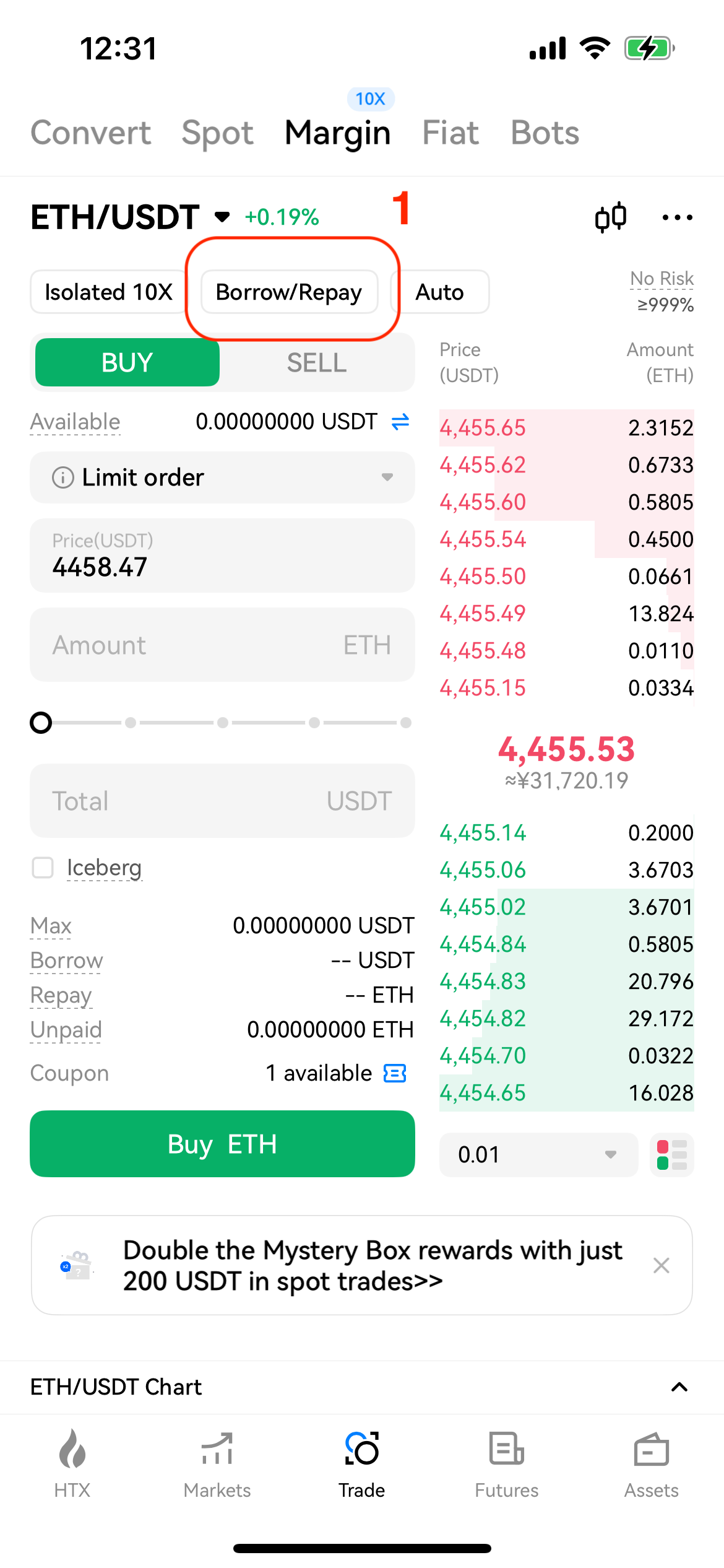 После перевода активов на маржинальный счёт вы можете использовать их как залог для займа. Нажмите “Займ”, чтобы перейти в режим ручного займа.