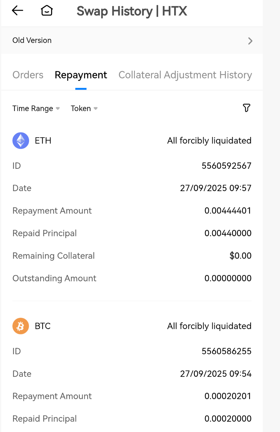 Перейдите на страницу «Стейкинг и заимствование», выберите [Записи об обмене монет], затем выберите [Записи о погашении]. Вы перейдете на страницу записей о погашении, где сможете просмотреть всю информацию о погашении.