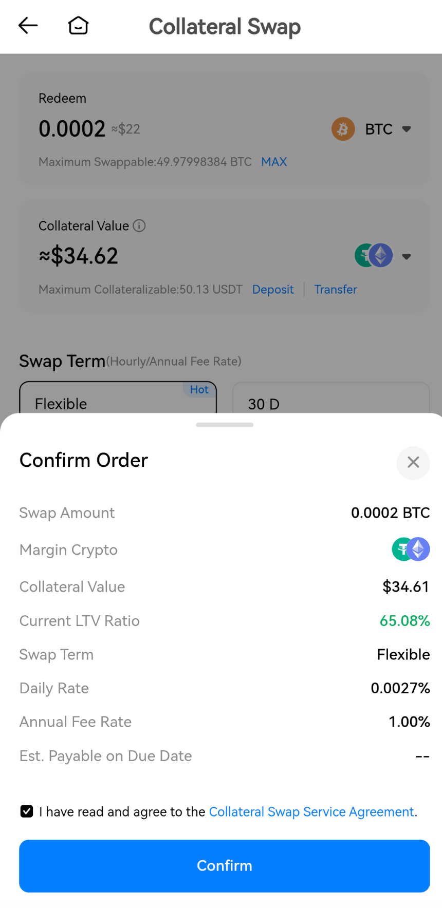 Зарегистрируйтесь в приложении HTX, нажмите [Больше] в меню, затем выберите [Залоговый своп], выполните следующие действия, чтобы начать процесс займа:
