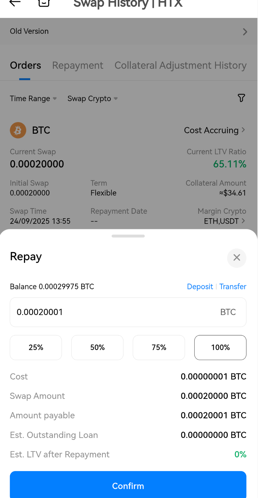 Обратите внимание: Пожалуйста, убедитесь, что на вашем биржевом аккаунте достаточно криптовалют для погашения процентов и основной суммы долга. После полного погашения вся сумма залога будет возвращена на ваш биржевой аккаунт.