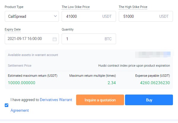Цена индекса контракта BTC/USDT составляет 45000 долларов США. Клиент A настроен на бычий тренд BTC и считает, что «он вырастет, но не знает, как долго рынок будет продолжать торговаться вбок», поэтому он/она покупает европейский спред колл в размере 41 000-51 000, срок действия которого истекает через три дни. Если цена растет, а прибыль составляет 10000 USDT, то чистый доход составляет 5740 USDT. Если рынок продолжает торговаться вбок, то прибыль составляет 6000 – 4260 = 1740 USDT. С помощью правильных стратегий вы можете торговать по разным рыночным сценариям.