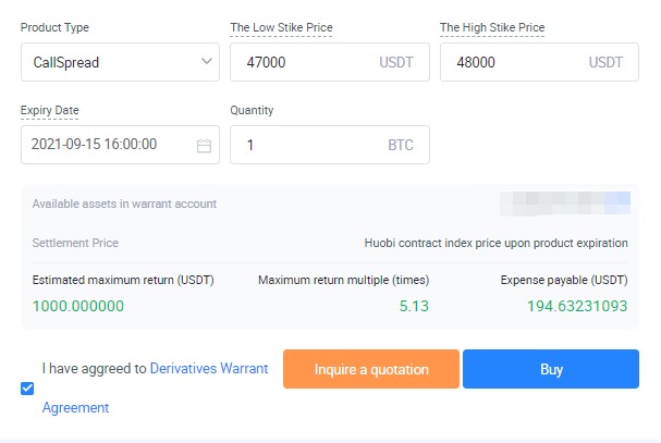 Клиент B придерживается противоположной точки зрения и считает, что «цена BTC несколько возрастет за два дня и останется между 47 000 и 48 000 за два дня», поэтому он/она покупает европейский колл спред в размере 47 000-48 000, срок действия которого заканчивается через два дня (как показано на рисунке ниже), с премией за опцион 194,63 USDT. Если решение верно, максимальная прибыль составляет 1000 USDT.