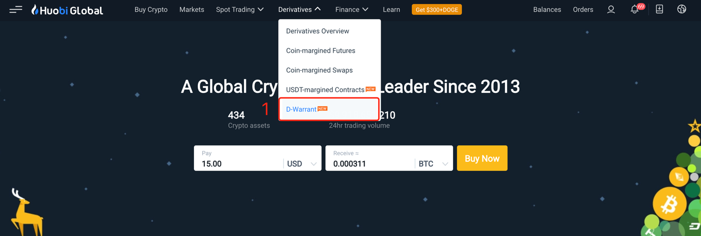 1. Перейдите на официальный сайт HTX: https://www.huobi.com/en-us/, переместите курсор на «Дервативы» на верхней панели навигации и нажмите «Опционы HTX».Или перейдите непосредственно по этой ссылке:https://www.huobi.com/en-us/otc-option/exchange